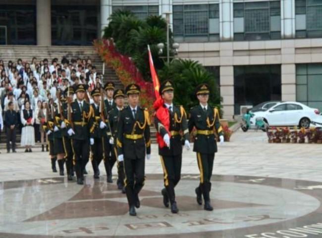 七时整,晨光初现,国旗护卫队步伐铿锵、目光坚毅,于《义勇军进行曲》的雄壮旋律中,升旗手振臂扬旗,五星红旗如赤焰般迎风舒展,冉冉升起。全体师生肃立注目,齐声高唱国歌,歌声响彻云霄,目光沉静而炽热,彰显对祖国的赤诚与坚定信仰。
